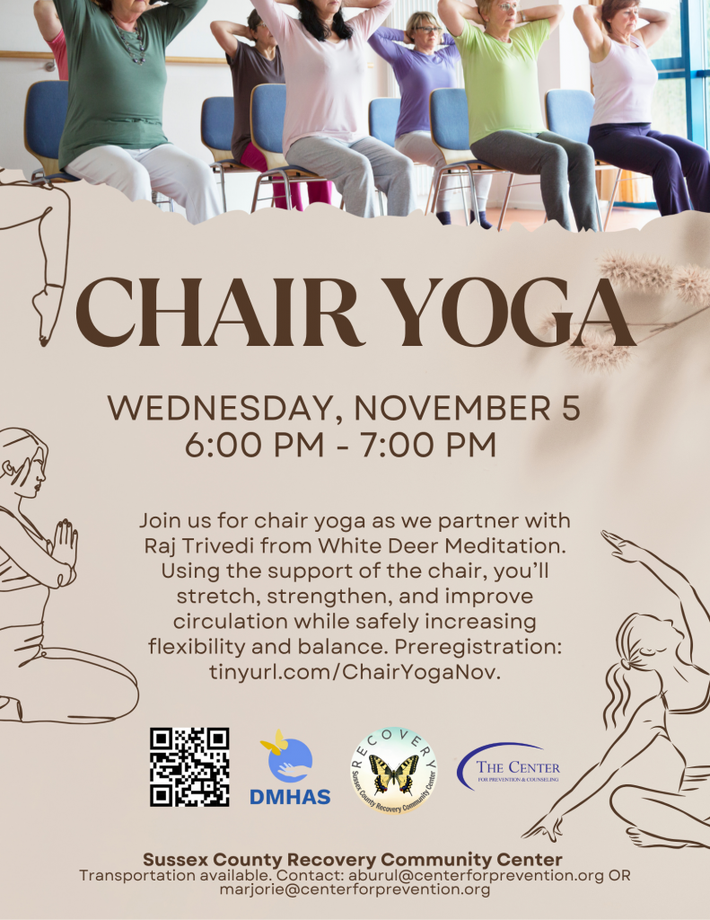 Join us for chair yoga as we partner with Raj Trivedi from White Deer Meditation. Using the support of the chair, you’ll stretch, strengthen, and improve circulation while safely increasing flexibility and balance. Preregistration: tinyurl.com/ChairYogaNov.