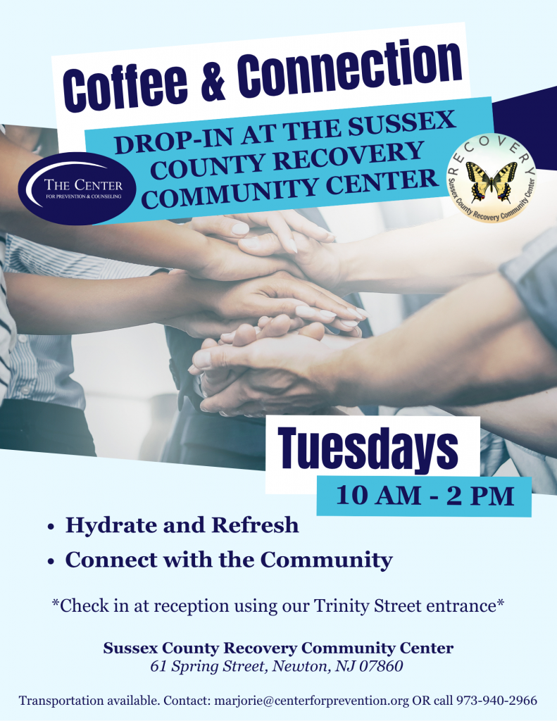 Join us for Coffee & Connection! Drop in at the Sussex County Recovery Community Center every Tuesday from 10 AM to 2 PM to relax, recharge, and connect with others in recovery.