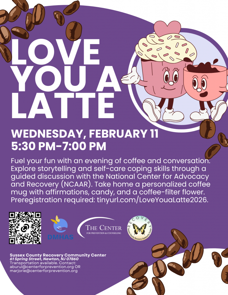 Fuel your fun with an evening of coffee and conversation. Explore storytelling and self-care coping skills through a guided discussion with the National Center for Advocacy and Recovery (NCAAR). Take home a personalized coffee mug with affirmations, candy, and a coffee-filter flower. Preregistration required: tinyurl.com/LoveYouaLatte2026.