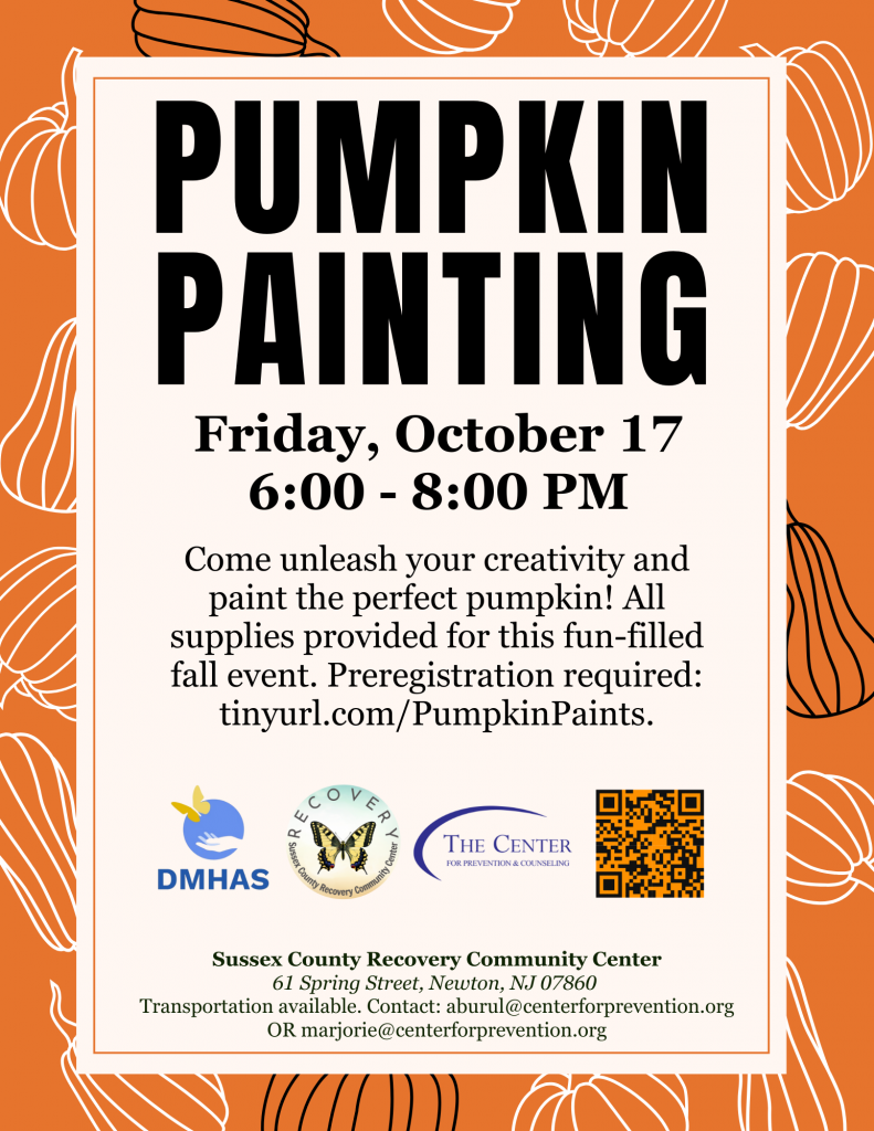 By Morgan LeeSeptember 5, 2025 Pumpkin Painting 75 75 people viewed this event. Come unleash your creativity and paint the perfect pumpkin! All supplies provided for this fun-filled fall event. Preregistration required: tinyurl.com/PumpkinPaints. Register for event To register for this event email your details to aburul@centerforprevention.org Register using webmail: Gmail / AOL / Yahoo / Outlook Date And Time 10-17-2025 @ 06:00 PM Location Center for Prevention and Counseling, Newton, NJ 07860 Event Types Recovery Event Category Recovery Share With Friends Facebook Twitter Linkedin Xing Pinterest